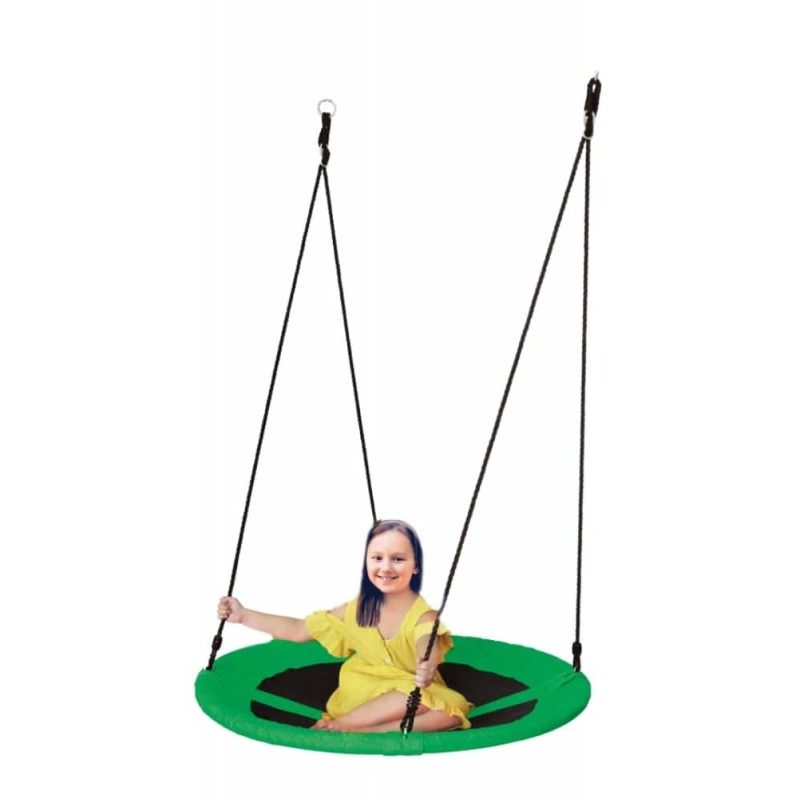 Υπαίθρια κούνια ανοιχτή φωλιά πράσινη, Ø 90cm. Τα σχοινιά είναι κατασκευασμένα από ισχυρό πλαστικό, έχουν διάμετρο 10mm και ρυθμίζονται σε ύψος από 90cm έως 180cm. Το σετ αποτελείται από 4 κυρτούς μεταλλικούς σωλήνες Ø 2,5εκ που καλύπτονται με πλαστικό σωλήνα foam και κουμπώνουν μεταξύ τους σχηματίζοντας κύκλο Ø 90εκ. Μέγιστο φορτίο αναβάτη: 100kg.
