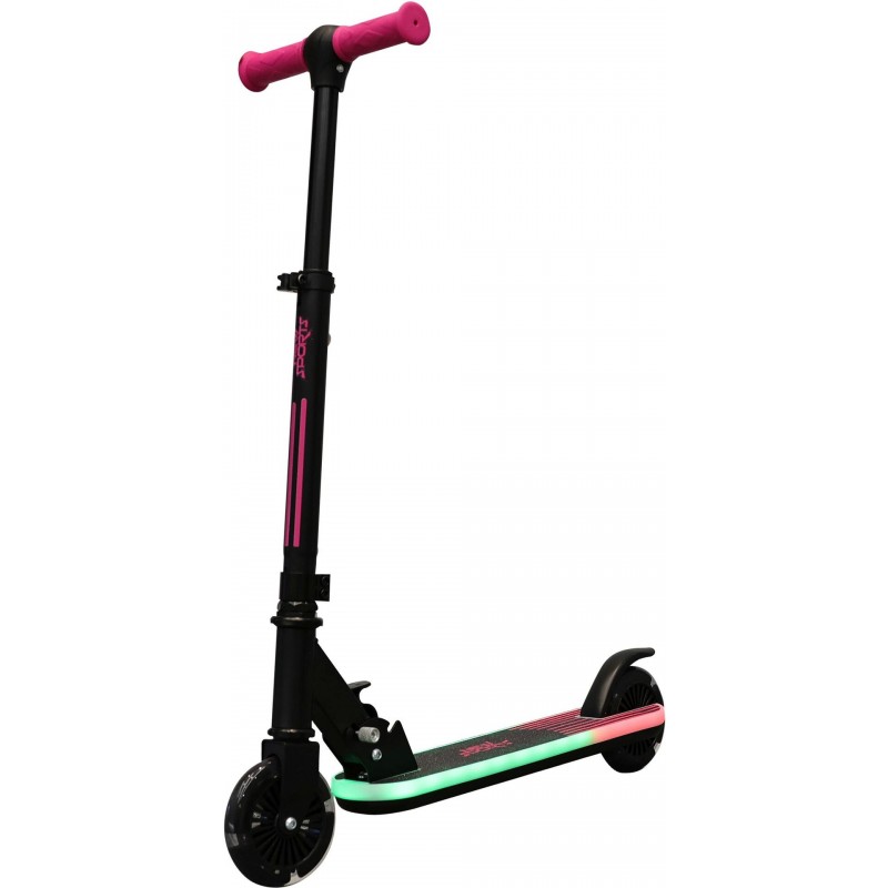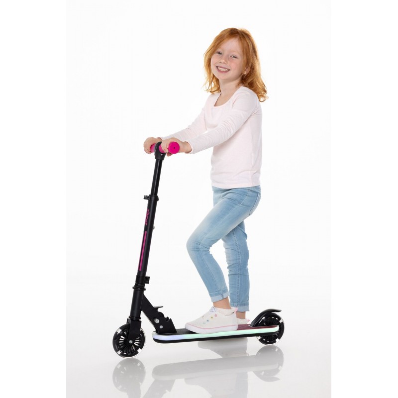 Δίροδο πατίνι με ελαστικά και πλατφόρμα με φωτισμό LED. Ελαστικά PVC 120 mm, ρουλεμάν ABEC7. Μέγιστη ικανότητα φορτίου περίπου 50 kg. Διαστάσεις περίπου 66 x 25 x 77 cm. Για παιδιά ηλικίας 3 ετών και άνω. Δεν περιλαμβάνονται μπαταρίες.