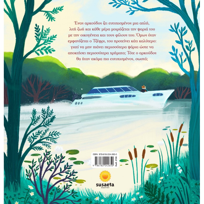 Ένας αρκούδος ζει ευτυχισμένος μια απλή ζωή, λιτή ζωή και κάθε μέρα μοιράζεται την ψαριά του με την οικογένεια του και τους φίλους του. Όμως όταν εμφανίζεται ο Τζέφρι, του προτείνει κάτι καλύτερο: γιατί να μην πιάνει περισσότερα ψάρια ώστε να αποκτήσει περισσότερα χρήματα. Τότε ο αρκούδος θα ήταν ακόμα πιο ευτυχισμένος, σωστά; (ISBN: 978-618-224-265-0)
