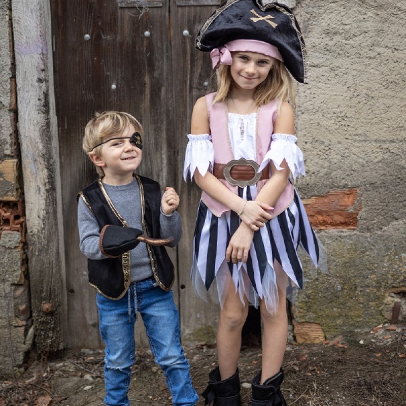 Εξαιρετικό φόρεμα Kira the Pirate Girl, για την περιπετειώδη μικρή σας πειρατική πειρατεία! Ετοιμαστείτε να σαλπάρετε για μια περιπέτεια στην ανοιχτή θάλασσα με αυτό το σαγηνευτικό σύνολο που συνδυάζει τολμηρό στυλ με θηλυκή πινελιά. Το κεντρικό κομμάτι αυτού του ντυσίματος είναι το εντυπωσιακό ροζ γιλέκο, διακοσμημένο με μια κομψή ζώνη που σφίγγει τη μέση για μια κολακευτική εφαρμογή. Σχέδιο με έξω τους ώμους, αποπνέει αυτοπεποίθηση και θράσος, ιδανικό για να διοικείτε το πλοίο με εξουσία. Η φούστα διαθέτει κλασικές ασπρόμαυρες ρίγες με ακανόνιστες άκρες, που θυμίζουν κυματιστά κύματα και πανιά που φουσκώνουν. Η πειρατική στολή είναι ολοκληρωμένη με ένα πειρατικό καπέλο στολισμένο με ένα ροζ φιόγκο γύρω από την περιφέρειά του. Με την ζωηρή κλίση και την παιχνιδιάρικη πινελιά του, αυτό το καπέλο προσθέτει την τέλεια τελική πινελιά στην ατρόμητη εμφάνιση της Kira. Πλύσιμο στο πλυντήριο σε απαλό πρόγραμμα με κρύο νερό, χωρίς χλωρίνη, αργό στέγνωμα, σιδέρωμα σε χαμηλή θερμοκρασία.
