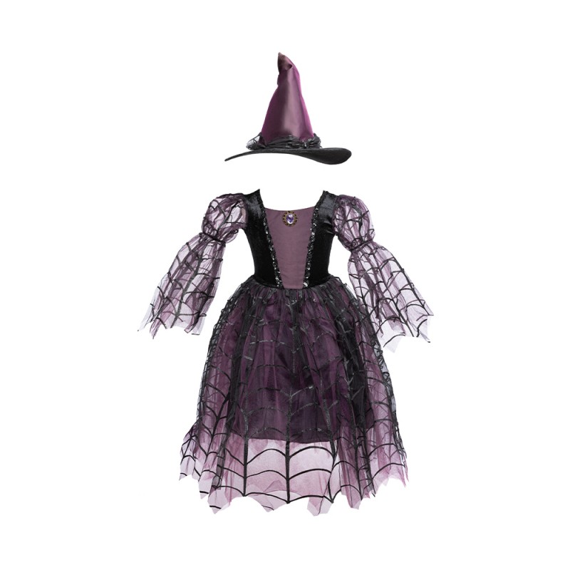Στολή μάγισσας ένα κοστούμι που συνδυάζει μυστήριο και κομψότητα, ιδανικό για μικρές μαγισσούλες που λατρεύουν τη μεταμφίεση. Το φόρεμα σε βαθύ μωβ χρώμα, εμπνευσμένο από τις σκιές του λυκόφωτος, είναι διακοσμημένο με λαμπερά σχέδια ιστού αράχνης που αντανακλούν το φως σαν φεγγαρόφωτο. Η φαρδιά του φούστα κουνιέται μαγευτικά σε κάθε βήμα, χαρίζοντας κίνηση και ατμόσφαιρα μυστηρίου. Το σετ ολοκληρώνεται με το μυτερό καπέλο, στολισμένο με αραχνούλες, για αληθινά μαγικά ξόρκια και περιπέτειες κάτω από το φως του φεγγαριού. Ένα κοστούμι υψηλής ποιότητας που χαρίζει χαρά, δημιουργικότητα και αμέτρητες στιγμές παιχνιδιού. Φροντίδα: Πλύσιμο στο πλυντήριο σε χαμηλή θερμοκρασία, χωρίς χλώριο. Στέγνωμα σε σκιά, σίδερο σε χαμηλή θερμοκρασία.