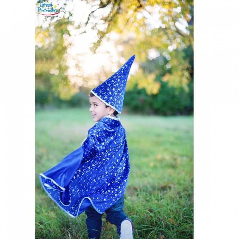 Μπορείτε να γίνετε ο καλύτερος μάγος όλων των εποχών με την εντυπωσιακή στολή της εταιρείας Great Pretenders! Το μπλε βελούδινο ύφασμα σε συνδυασμό με τα ασημί αστεράκια που στολίζουν την κάπα και το καπέλο θα τραβήξουν όλα τα βλέμματα πάνω σας! Κουμπώνει εύκολα με βέλκρο. Κατάλληλο από 4 έως 6 ετών.