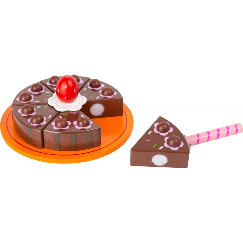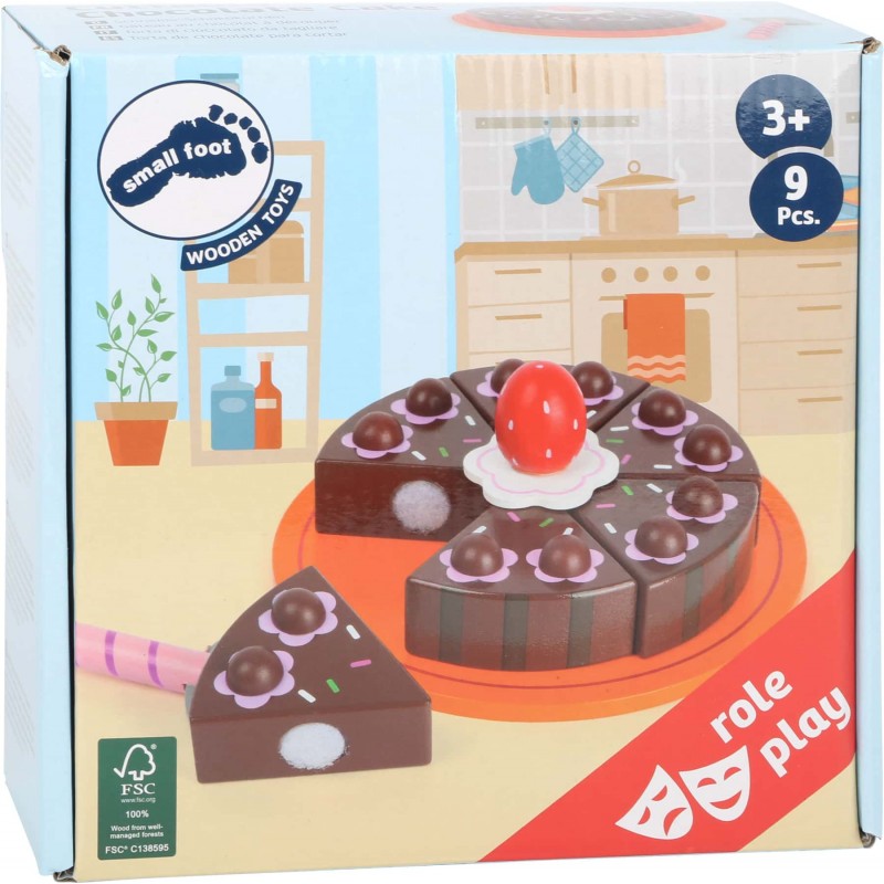 Καλέστε τους φίλους σας, για να δοκιμάσουν ένα κομμάτι από το κέικ σοκολάτας που ετοιμάσατε! Ένα κέικ σοκολάτας φτιαγμένο από FSC® 100% πιστοποιημένο ξύλο που πραγματικά μοιάζει με τις εικόνες στα βιβλία. Έξι κομμάτια σοκολάτας ίσου μεγέθους κρατιούνται μαζί με Velcro και μπορούν να διαχωριστούν με τη σπάτουλα του κέικ. Ο πολύχρωμος δίσκος και οι αφαιρούμενες φράουλες προσελκύουν τα μάτια στο τραπέζι του καφέ. Παιχνίδι ρόλου που τα παιδιά αναπτύσσουν τη δημιουργικότητα, τις γλωσσικές δεξιότητες, την κοινωνικοποίηση. Διαστάσεις κομματιού κέικ 6Χ6Χ2.5εκ. Περιέχει 9 κομμάτια.