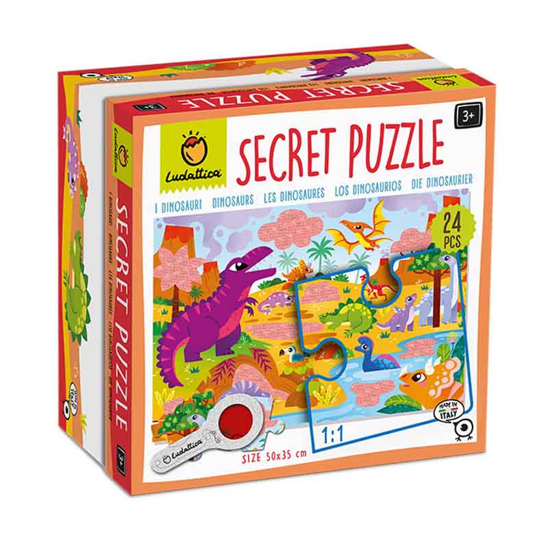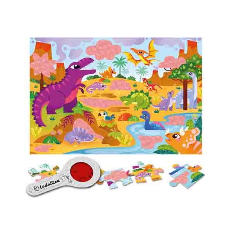 Παζλ 24 κομματιών με θέμα τον κόσμο των δεινοσαύρων με ένα πρωτότυπο φακό για έξτρα διασκέδαση! Το παιδί συνθέτει το παζλ και στη συνέχεια με το φακό ανακαλύπτει διάφορες μικρολεπτομέρειες που κρύβονται, μέσα στην εικόνα, στα κομμάτια με την αχνή εικονογράφηση! Ένα διασκεδαστικό παιχνίδι που ενδυναμώνει τις λεπτές κινητικές δεξιότητες, τονώνει την περιέργεια και την παρατηρητικότητα και παράλληλα αυξάνει τη συγκέντρωση του παιδιού. Διαστάσεις παζλ: 50 x 35εκ.