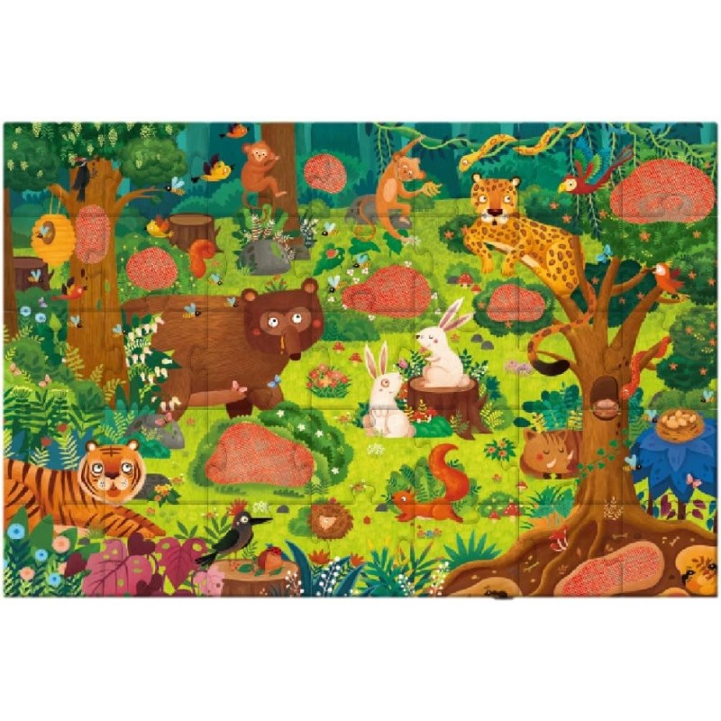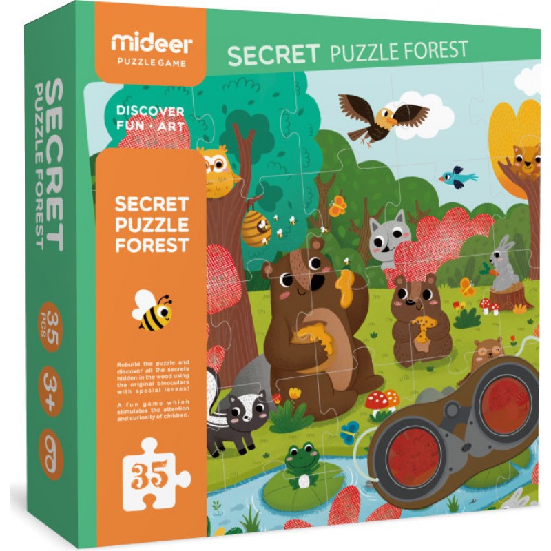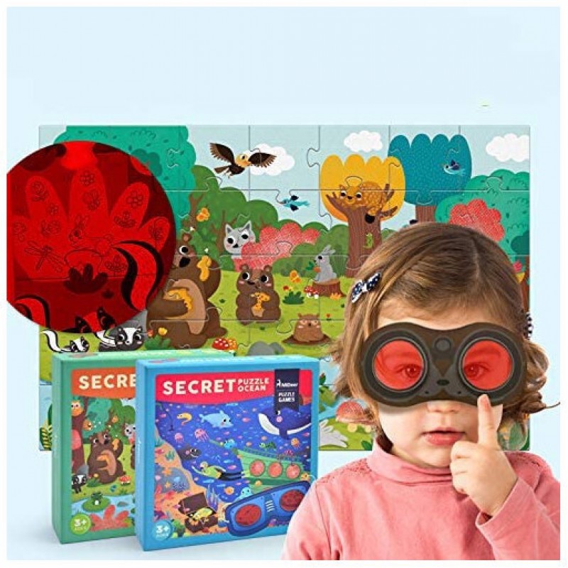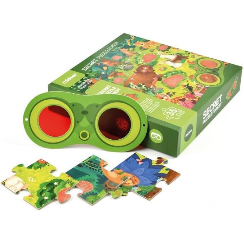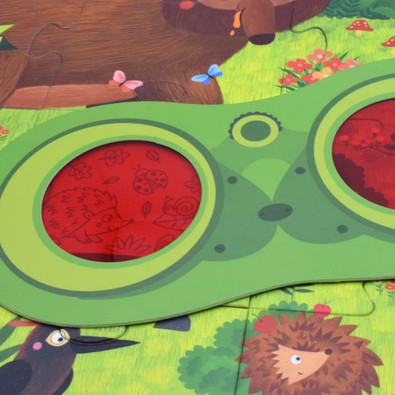 Παζλ από οικολογικό χαρτόνι με λείες, γυαλισμένες άκρες. Παζλ 2 σε 1: πολύ περισσότερο από ένα παζλ 35 κομματιών, τα παιδιά μπορούν να χρησιμοποιήσουν τα γυαλιά ντετέκτιβ για να βρουν τα πλάσματα που κρύβονται στις κόκκινες περιοχές του παζλ. Ένα εκπαιδευτικό και διασκεδαστικό παιχνίδι-εξερευνήστε τι κρύβεται στο δάσος. Το παιδί μπορεί επίσης να διασκεδάσει μετρώντας όλα τα ζώα. Κατάλληλο για ηλικίες 3 και άνω.