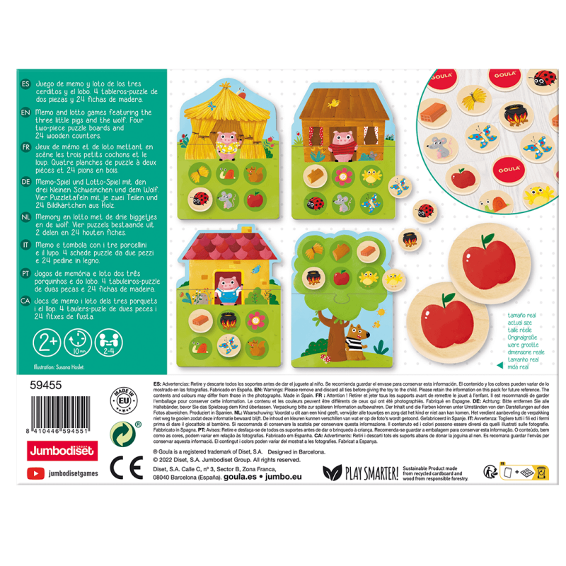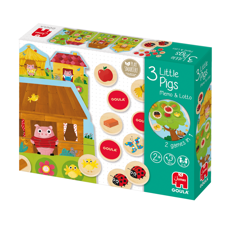 Το The 3 Little Pigs Memo & Loto της Goula είναι ένα εκπαιδευτικό παιχνίδι προσχολικής ηλικίας για παιδιά από 2 ετών. Παίξτε με τα τρία γουρουνάκια και τον λύκο με τον τρόπο που προτιμάτε: μνήμης και Loto. Πώς παίζεται; Λόττο: Κάθε παίκτης επιλέγει έναν πίνακα και τον συναρμολογεί προσαρμόζοντας τα δύο κομμάτια μεταξύ τους. Τα ξύλινα πλακάκια αναμειγνύονται και αφήνονται ανάποδα, έτσι ώστε, με τη σειρά, οι παίκτες να αναποδογυρίζουν ένα από αυτά τυχαία. Εάν το πλακίδιο περιέχει ένα αντικείμενο που ταιριάζει με κάτι στον πίνακα σας, θα το τοποθετήσετε πάνω του και θα συνεχίσετε να περιστρέφετε πλακίδια. Ο πρώτος παίκτης που θα συμπληρώσει το ταμπλό του θα γίνει νικητής! Μνήμης: Σε αυτήν τη λειτουργία παιχνιδιού οι πίνακες δεν χρησιμοποιούνται. Για να παίξουμε, ανακατεύουμε τα ξύλινα πλακάκια του εκπαιδευτικού παιχνιδιού και τα αφήνουμε ανάποδα. Με τις στροφές, κάθε παίκτης γυρίζει δύο πλακίδια, και αν ταιριάζουν, τα κρατάει και συνεχίζει να παίζει. Αν δεν ταιριάζει, τους αφήνει πάλι ανάποδα, προσπαθώντας να απομνημονεύσει τη θέση τους. Θα μπορέσουν να θυμηθούν; Το παιχνίδι τελειώνει όταν δεν απομένουν άλλα πλακίδια για περιστροφή. Ο παίκτης με τα περισσότερα ζευγάρια θα είναι ο νικητής!