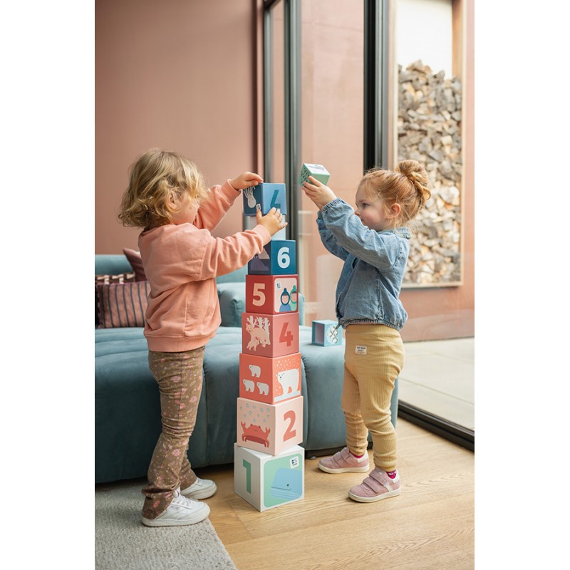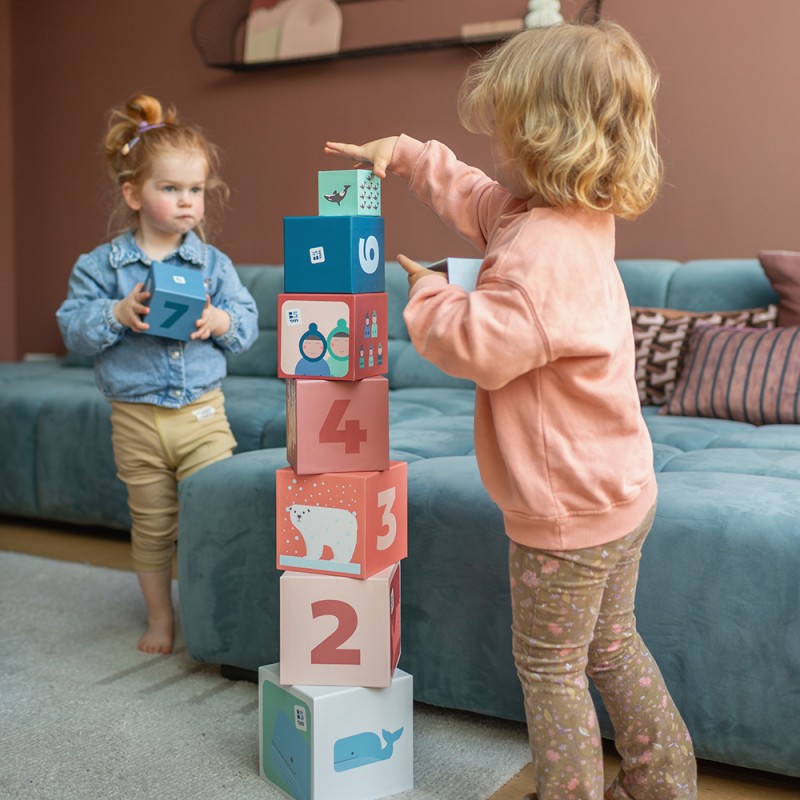 Παρουσιάστε στα νήπια σας τους αριθμούς με διασκεδαστικό τρόπο στοιβάζοντας τα ελαφριά, στιβαρά κυβάκια από χαρτόνι για να φτιάξετε έναν ψηλό πύργο. Όταν το μωρό είναι περίπου ενός έτους θα διαλύει όλο υπερηφάνεια τους χάρτινους κύβους και θα είναι μέρος του παιχνιδιού του μαζί σας. Με τον καιρό θα τοποθετήσει τον ένα κύβο μέσα στον άλλο, πλάι στο άλλο και το ζωάκι από πάνω και σιγά σιγά θα κάνει ολόκληρα κατασκευή.