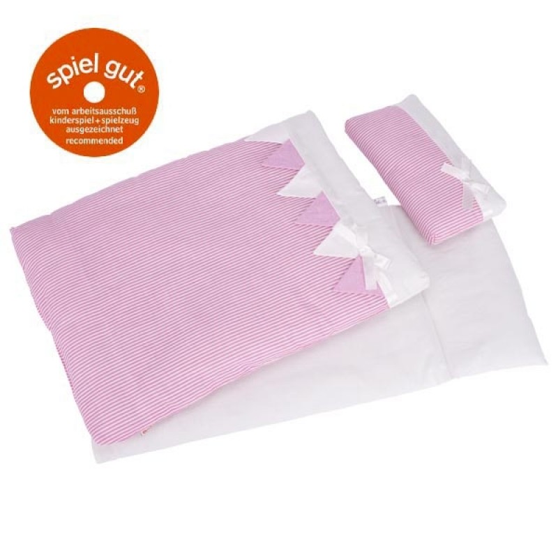 Διάλεξε τα υπέροχα κλινοσκεπάσματα που περιλαμβάνουν μαξιλαράκι, στρώμα και σκέπασμα για την κουκλίτσα σου σε σχέδιο ροζ ρίγες και το παιχνίδι ξεκινά. Στόλισε το κρεβατάκι της κούκλας σου με τα όμορφα σκεπάσματα.