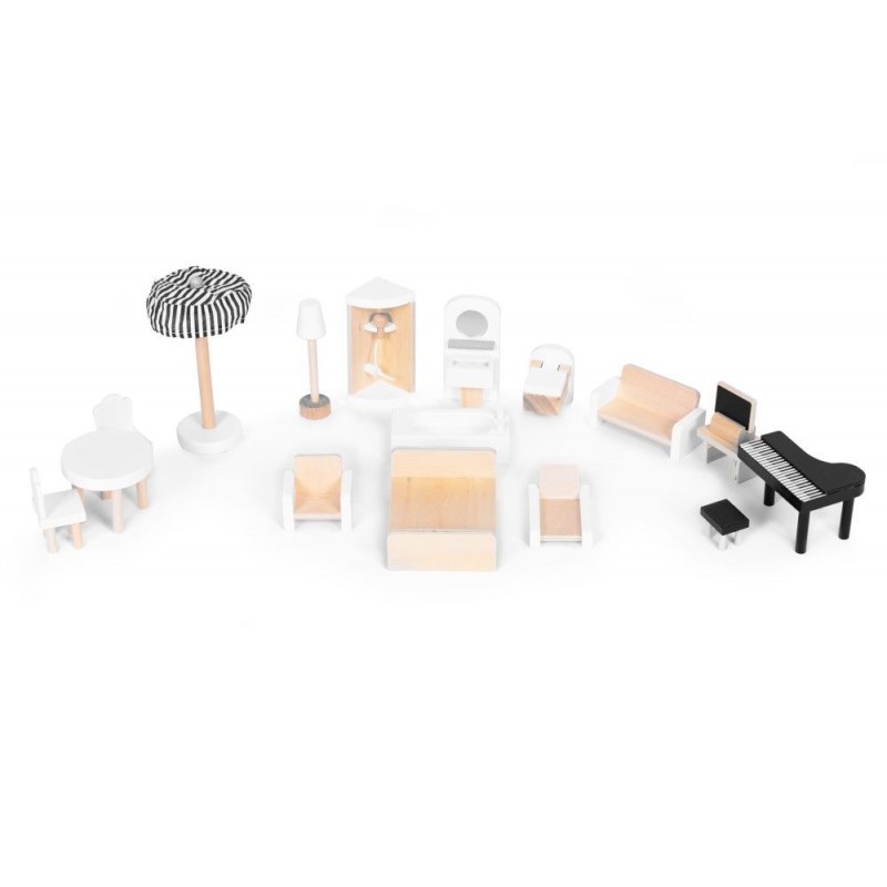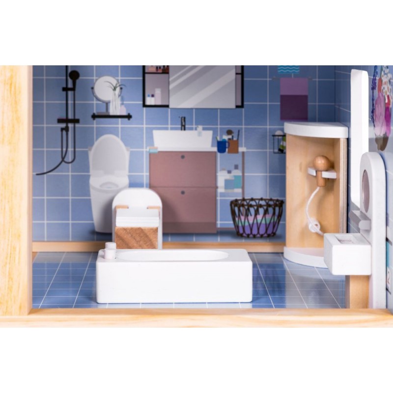 Ξύλινο κουκλόσπιτο, ένα γοητευτικό σετ που θα προσφέρει ώρες δημιουργικού παιχνιδιού. Κατασκευασμένο από ξύλο υψηλής ποιότητας, είναι ανθεκτικό και ασφαλές για τα παιδιά. Το σπίτι έχει διάφορους ορόφους και δωμάτια εξοπλισμένα με κομψά έπιπλα, επιτρέποντας στα παιδιά να σχεδιάσουν το εσωτερικό σύμφωνα με τις δικές τους ιδέες. Χάρη στον αισθητικό του σχεδιασμό και τις πολύχρωμες λεπτομέρειες, αυτό το σπίτι θα αποτελέσει μια όμορφη προσθήκη στο παιδικό δωμάτιο και θα αναπτύξει τη φαντασία και τις χειρωνακτικές τους δεξιότητες.