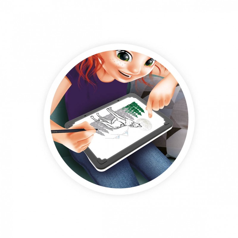 Περιλαμβάνεται μια τσάντα σχεδίασης με: μπλοκ, 30 φύλλα A5 (21X14,8 εκ.), 100 φύλλα (11,4X6,5), 1 μεταλλικό κλιπ, 2 σετ στένσιλ, 4 φύλλα αυτοκόλλητων, 12 τυπικές τσόχες, 12 στυλό με πινέλο, 12 μολύβια ακουαρέλας, 1 πινέλο, 2 στυλό τζελ, 1 λεπτό στυλό, 1 μολύβι, 1 λαστιχάκι, 1 χάρακας, 1 ξύστρα και 1 φύλλο οδηγιών.Απαιτούνται 4 μπαταρίες LR03-AAA (δεν περιλαμβάνονται).
