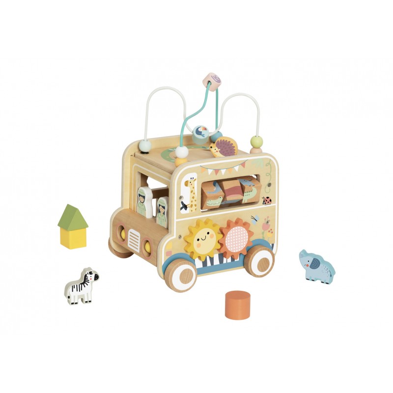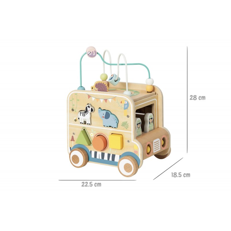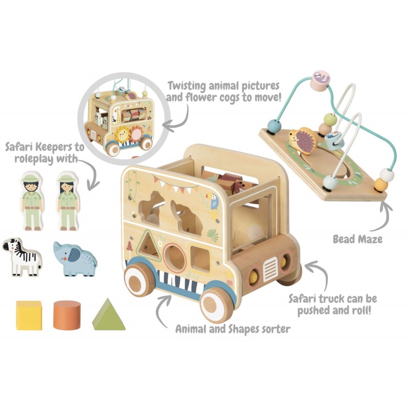 Ξεκινήστε μια συναρπαστική περιπέτεια σαφάρι με το Ευέλικτο Όχημα Σαφάρι για Κυνήγι, ένα πολυλειτουργικό ξύλινο παιχνίδι δραστηριοτήτων σχεδιασμένο να εμπνέει τη φαντασία και να ενισχύει την πρώιμη μάθηση. Κατασκευασμένο από ξύλο πιστοποιημένο κατά FSC και βαμμένο με ασφαλή, μη τοξικά χρώματα για παιδιά, αυτό το ανθεκτικό παιχνίδι προσφέρει ατελείωτες ώρες διασκέδασης για μικρά παιδιά. Τα παιδιά μπορούν να σπρώχνουν το στιβαρό όχημα και να προσποιούνται ότι εξερευνούν την άγρια φύση μαζί με τις φιγούρες ζώων σαφάρι και τους φύλακες ζωολογικού κήπου που περιλαμβάνονται. Το όχημα διαθέτει δραστηριότητες σε κάθε πλευρά, βοηθώντας στην ανάπτυξη βασικών δεξιοτήτων. Περιλαμβάνει ταξινομητή σχημάτων, λαβύρινθο με χάντρες, μίνι άβακα, συρόμενο λαβύρινθο, περιστρεφόμενα γρανάζια και περιστρεφόμενο δίσκο με ζώα, ενισχύοντας τη λεπτή κινητικότητα, την επίλυση προβλημάτων, την πρώιμη αριθμητική και την αναγνώριση χρωμάτων. Ιδανικό για αισθητηριακό παιχνίδι και για την καλλιέργεια της δημιουργικότητας μέσα από το παιχνίδι ρόλων και την εξερεύνηση.
