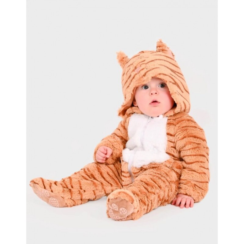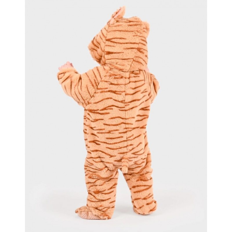 Βρεφική στολή τίγρης, τρυφερή, ζεστή και απίστευτα απαλή, ιδανική για τις πρώτες μεταμφιέσεις και τις πιο γλυκές στιγμές παιχνιδιού. Ολόσωμη κατασκευή από μαλακό plush ύφασμα, σχεδιασμένη ειδικά για την άνεση και τη ζεστασιά του μωρού. Η κουκούλα διαθέτει απαλά αυτάκια και ανάγλυφο σχέδιο τίγρης, ενώ η λευκή κοιλίτσα στο μπροστινό μέρος δημιουργεί ένα γλυκό και παιχνιδιάρικο look. Το φερμουάρ μπροστά διευκολύνει το ντύσιμο και την αλλαγή πάνας.