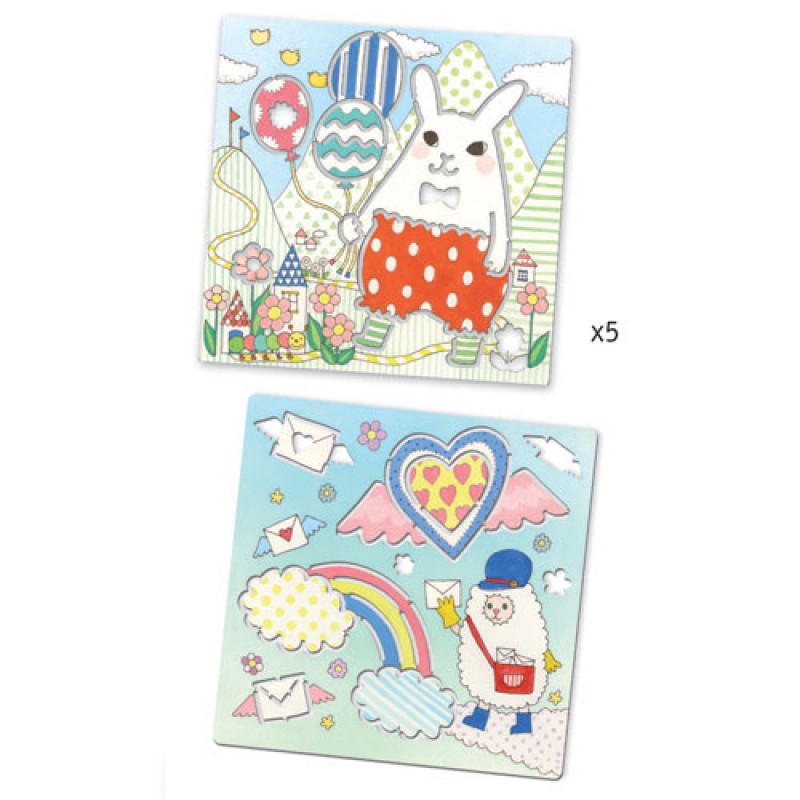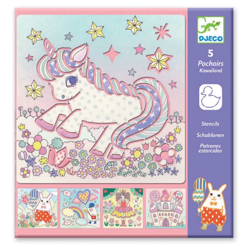 Με τα στένσιλ της εταιρείας Djeco οι φίλοι μας μπορούν να σχεδιάσουν παραμυθένιους μονόκερους παιχνιδιάρικα λαγουδάκια και κάστρα δημιουργώντας τις δικές τους ιστορίες! Η συσκευασία περιλαμβάνει 5 φύλλα στένσιλ. Κατάλληλο από 4 ετών και άνω.
