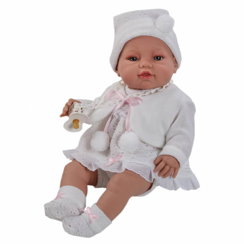 Μωρό 42εκ., κατασκευασμένο εξ ολοκλήρου από μαλακό βινύλιο. Έχει πιπίλα, φορά όμορφα ρούχα και συνοδεύεται από ένα απαλό ζακετάκι. Είναι Ισπανικό και αρωματισμένο με ευχάριστο άρωμα βανίλιας. Έχει αρθρώσεις σε χέρια και πόδια.