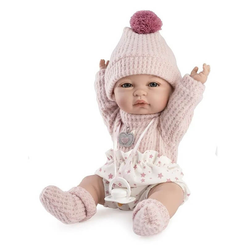 Μωρό 34εκ. εξαιρετικής ποιότητας, κατασκευασμένο εξ ολοκλήρου από μαλακό βινύλιο. Φορά όμορφα ρουχαλάκια και έχει πιπίλα. Είναι Ισπανικό και αρωματισμένο με ευχάριστο άρωμα βανίλιας. Έχει αρθρώσεις σε χέρια και πόδια και έτσι μπορεί να πάρει στάσεις κανονικού μωρού.
