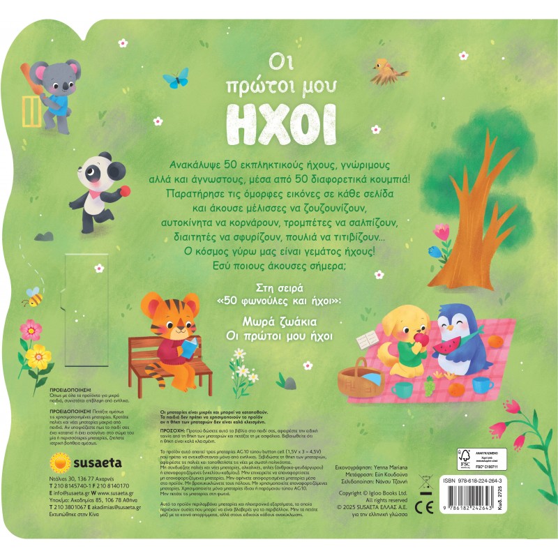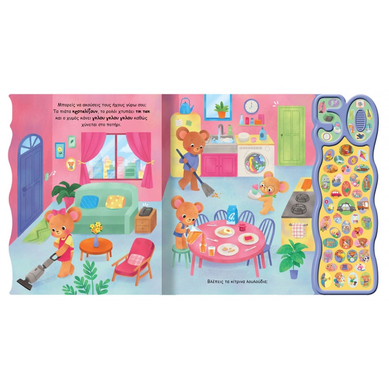 Ανακάλυψε 50 εκπληκτικούς ήχους, γνώριμους αλλά και άγνωστους, μέσα από 50 διαφορετικά κουμπιά! Παρατήρησε τις όμορφες εικόνες σε κάθε σελίδα και άκουσε μέλισσες να ζουζουνίζουν, αυτοκίνητα να κορνάρουν, τρομπέτες να σαλπίζουν, διαιτητές να σφυρίζουν, πουλιά να τιτιβίζουν… Ο κόσμος γύρω μας είναι γεμάτος ήχους! Εσύ ποιους άκουσες σήμερα; Σελίδες: 12 (ISBN: 978-618-224-264-3)
