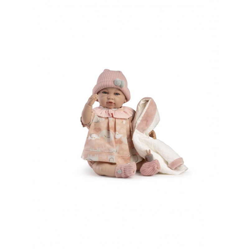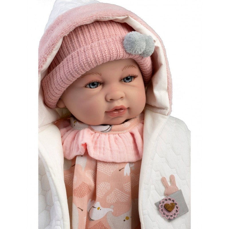 Κούκλα μωρό με ήχο και αρθρώσεις 50εκ. με σώμα μαλακό, χέρια και πόδια με αρθρώσεις και κατασκευασμένα από βινύλιο. Όταν το πιέζεις στο στήθος, κλαίει και φωνάζει μαμά-μπαμπά. Είναι ισπανικό κι αναδύει απαλό άρωμα βανίλιας.