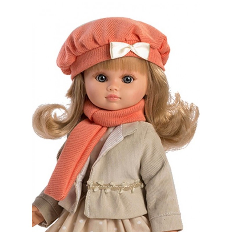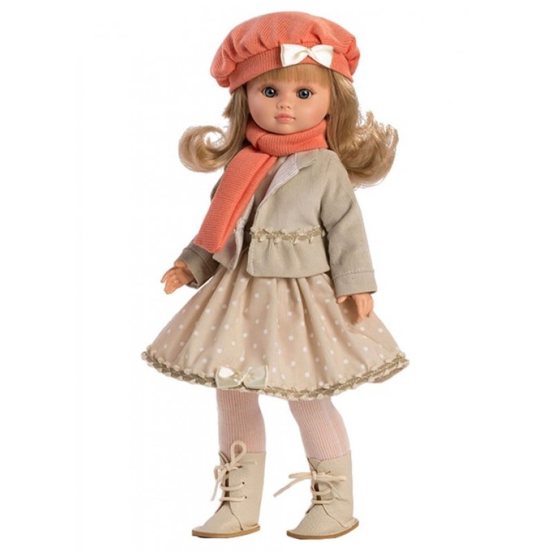 Ισπανική κούκλα από την εταιρεία Berbesa 40εκ. Φοράει ένα όμορφο φόρεμα με μπεζ τζάκετ, μπερέ με φιόγκο, σομόν κασκόλ και σομόν μπότες με καλσόν. Έχει αρθρώσεις από μαλακό βινύλιο.