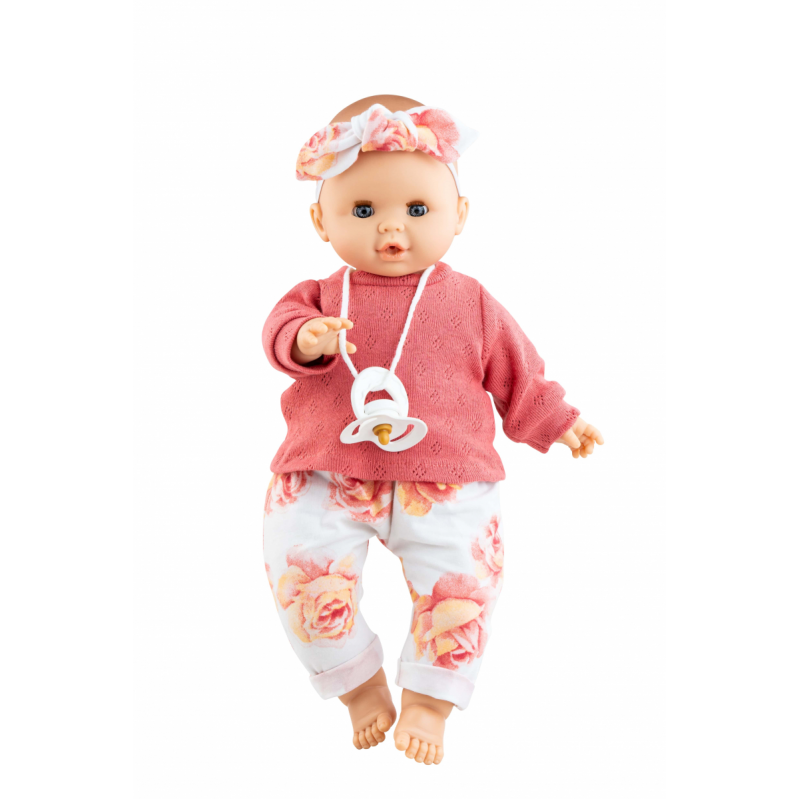 Κούκλα μωρό Sonia από τη διάσημη ισπανική εταιρεία Paola Reina. Τα χέρια, τα πόδια και το κεφάλι της κούκλας είναι κατασκευασμένα από vinyl με ελαφρύ άρωμα βανίλιας και ευχάριστη αίσθηση αφής. Η κούκλα έχει μαλακό κορμό και είναι ντυμένη με ένα γοητευτικό συνολάκι. Μπορεί να κλαίει και να λέει μαμά και μπαμπά. Φοράει ροζ μπλουζάκι, φλοράλ παντελόνι και κορδέλα στα μαλλιά.