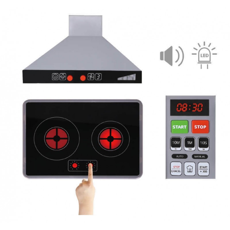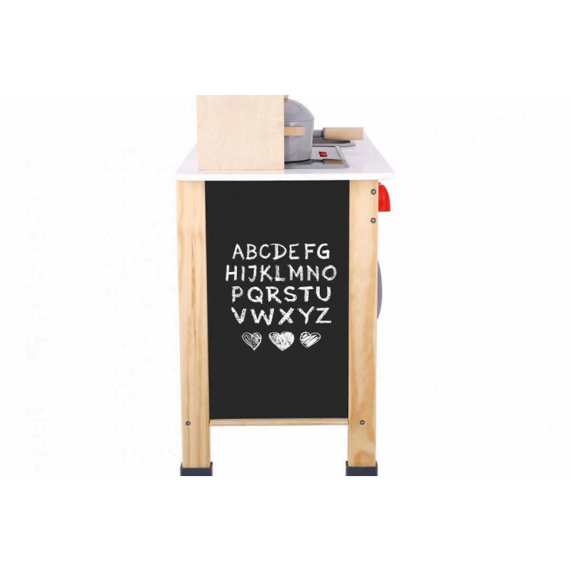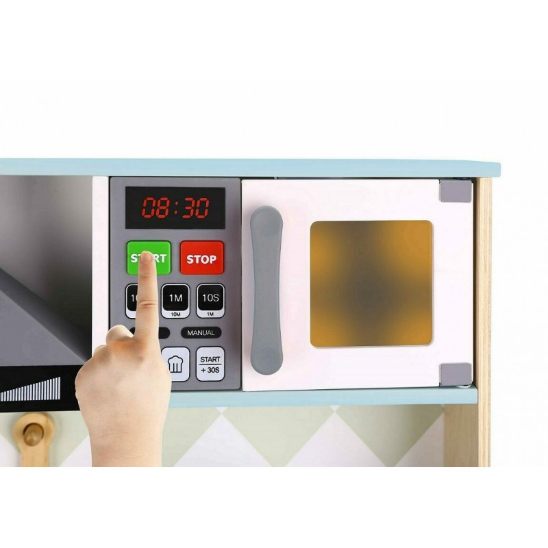 Το σετ αποτελείται από 10 ξύλινα εξαρτήματα σε διάφορα μεγέθη, όπως κατσαρόλα, τηγάνι, κουτάλα, σπάτουλα, πιρούνα, καθώς και αξεσουάρ όπως αλάτι και πιπέρι. Μετά τη συναρμολόγηση, η κουζίνα περιλαμβάνει φούρνο, εστίες, απορροφητήρα, φούρνο μικροκυμάτων, βρύση και αποθηκευτικά ράφια. Στο πλάι διαθέτει μαυροπίνακα για σημειώσεις ή ζωγραφιές. Μέσα από το παιχνίδι, το παιδί εξασκεί την επικοινωνία, τον συντονισμό χεριού-ματιού, την ικανότητα παρατήρησης και μίμησης, ενώ παράλληλα ενισχύεται η δημιουργική του σκέψη και η αυτοπεποίθησή του. Επιπλέον, προσφέρει την ευκαιρία πειραματισμού και εξερεύνησης της καθημερινότητας μέσα από ένα ασφαλές περιβάλλον. Η κουζίνα προσομοιάζει μια πραγματική κουζίνα, καθώς διαθέτει λειτουργίες φωτισμού και ήχου που ενισχύουν την εμπειρία του παιχνιδιού.
