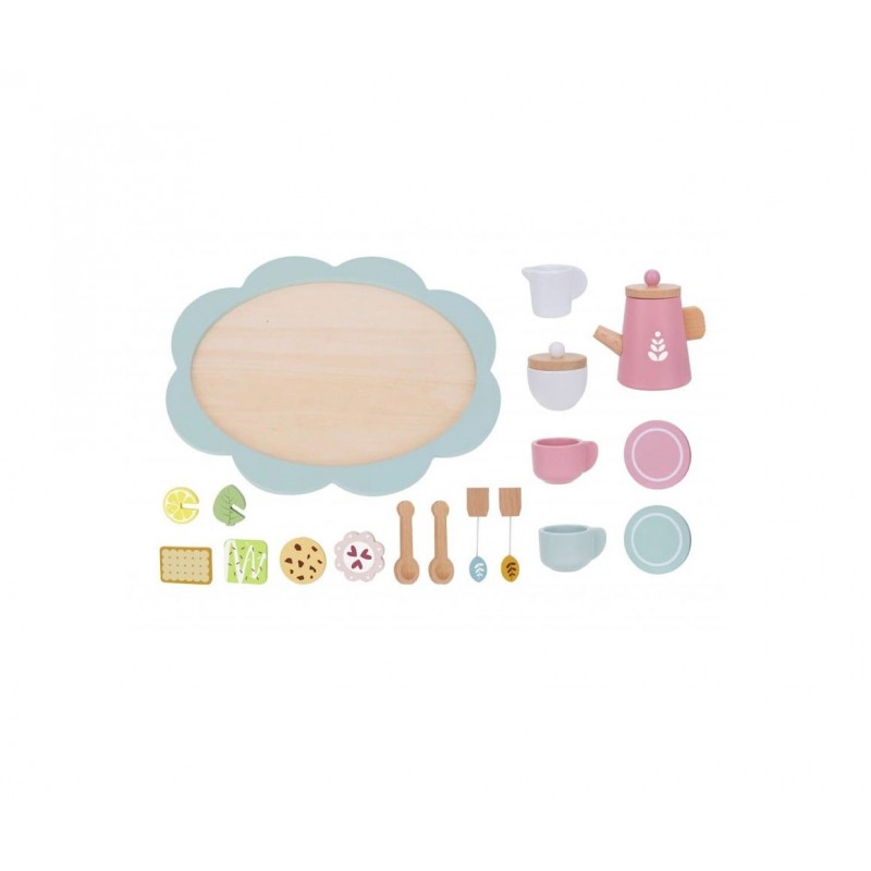 Ώρα για τσάι! Αυτό το ξύλινο σετ τσαγιού σε υπέροχα παστέλ χρώματα είναι η τέλεια προσθήκη σε κάθε παιδικό δωμάτιο! Ο όμορφος σχεδιασμός του θα ταξιδέψει τα παιδιά στον κόσμο του παιχνιδιού, διοργανώνοντας πάρτι τσαγιού για την οικογένεια και τους φίλους τους. Το σετ περιλαμβάνει φλιτζάνια, πιατάκια, μια τσαγιέρα, μια κανάτα γάλακτος, μια ζαχαριέρα, κουταλάκια του γλυκού και έναν δίσκο με γλυκά.