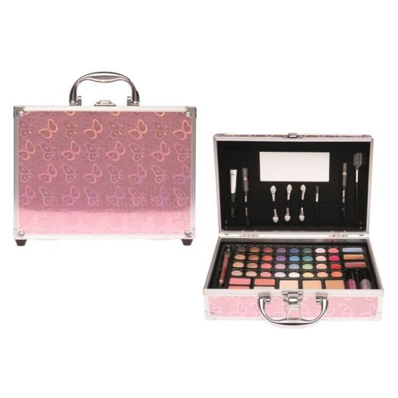 Ομορφο βαλιτσάκι μακιγιάζ αλουμινίου με πεταλούδες. Περιεχόμενα: 1 σετ καλλυντικών με 28 σκιές ματιών, 1 πούδρα προσώπου, 3 κραγιόν, 1 ρουζ, 4 κρέμες για σκιές ματιών, 2 lip glosses, 1 βούρτσα χειλιών διπλής όψης, 1 βούρτσα ματιών διπλής όψης, 1 καθρέφτης, 3 βούρτσες καλλυντικών.