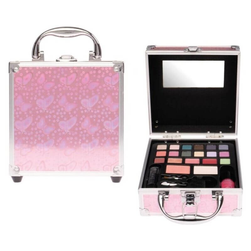 Mini Βαλιτσάκι μακιγιάζ αλουμινίου με πεταλούδες. Περιεχόμενα: 1 x καθρέφτης, 14 x σκιές ματιών, 3 x λαμπερά χρώματα χειλιών, 1 x ρουζ, 1 x πούδρα προσώπου, 1 x κραγιόν, 1 x βερνίκι νυχιών, 2 x βούρτσες καλλυντικών, 1 x απλικατέρ.