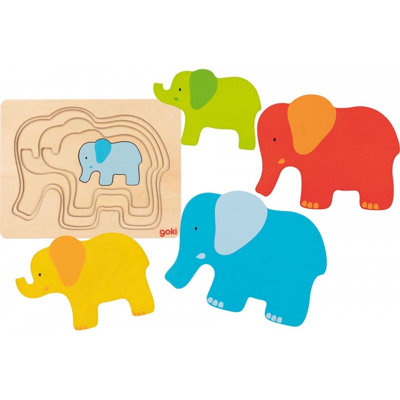 Goki παζλ με θέμα τον ελέφαντα , κατάλληλο για παιδιά από δύο ετών που προσφέρει πολλές ώρες διασκέδασης. Αποτελείται από 5 ξεχωριστά κομμάτια και έναν πίνακα παζλ. Εκπαιδεύεται η αρχική αναγνώριση των σχημάτων και η αντιστοίχιση τους.